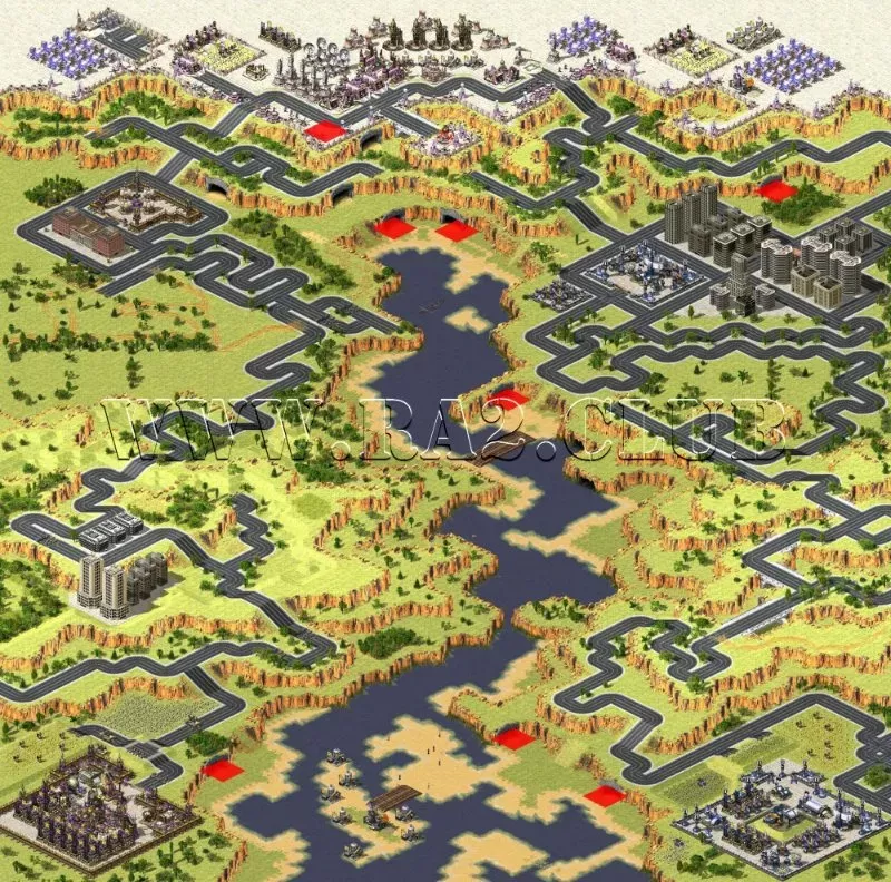 提示:美军与法军(绿色的)已经结盟,法军会有巨炮协防美军。敌方坦克部队十分强大做好防守,己方铁幕会有尤里建筑协防。